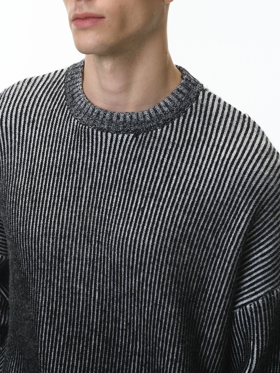 Men's Striped Rib Knit Crew Neck Sweater - Black Grey Oversized Fit